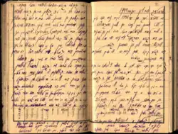 Yitskhok Rudashevski (10 December 1927, Vilnius – 1 October 1943) was a young Jewish teenager who lived in the Vilna Ghetto, Lithuania. He wrote a diary from June 1941 to April 1943 which detailed his life and struggles living in the ghetto. He was shot to death in the Ponary massacre during the liquidation of September–October 1943.[1] His diary was discovered by his cousin Sorah/Sarah née Voloshina Kliwiec/Klivetz/Klibatz, Hebrew: קליבץ), in 1944. She escaped the ghetto, fought with the Jewish partisans, and when Vilnius was liberated, she returned to the hideout.[2][3]