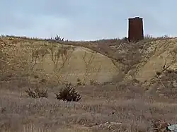 An abandoned railroad alignment is south of the present county highway, with the original highway alignment lying 300 yards (270 m) to the north in the old townsite. The original alignment of the railroad was cut across the slump blocks that had slid from the slope into the creek, which was undercutting the bluff. Slumping is characteristic on bluffs of the Fort Hays Escarpment, where the deep Carlile Shale weathers away but is unable to support high, steep slopes.[75][76] As in the Benecke photograph of the treeless Hog Back, this slump formed a narrow terrain between the deep banks of Big Creek and the steep slope of the bluff. The blocks of the slump obstructed wagon traffic west from Fort Hays, which found routes over the Hog Back further south.[77][7] The railroad, however, was able to cut a roadbed through the slumping. Unfortunately, the slump was not stable and the railroad repeatedly repaired the shifting roadbed over the decades. By the early 1900s, railroad surveyors considered tunneling through the Hogback.[78] Eventually, the railroad drove many pilings into the bank (still visible from the highway), but failed to stabilize the roadbed. In 1951–52,[79][80] Union Pacific straightened the alignment of the tracks to cut across the bow of Big Creek though the abandoned townsite, also cutting a new channel for the creek about 500 feet (150 m) to the north.[81] The portion of original creek channel at the base of the bluff remains, water still occasionally ponding where Benecke's sportsmen fished in 1873.[82][83][84]