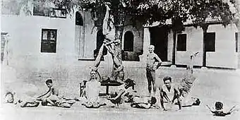 The yoga scholar Elliott Goldberg comments that the photographs of Krishnamacharya's schoolboy pupils in the poses "don't truly capture yogins using their body as a tool for spiritual development either. In fact, the photos demystify whatever spirituality may obtain to the exercises."[5] He adds that the group photographs are "showy ... eye-catching tricks", with boys in familiar asanas but arranged in a pyramid.[14] The vinyasa system of yoga, too, was in Goldberg's view "spectacularly different" from anything practised in India at the time;[15] he is dismissive of Krishnamacharya's "spurious claim for the ancient origin of Vinyasa yoga",[6] citing Singleton's analysis in Yoga Body of its origins in Surya Namaskar, suggesting "self-aggrandizement and self-protection" as the motives.[6] Despite all this, Goldberg states that Krishnamacharya's main interest in yoga was to nourish spirituality (adhyatmika krama), quoting his words in Yoga Makaranda: "Once you stop the oscillating nature of mind, you can reach the level[s] of dhyana, nididhyasanam, and samadhi [the highest levels of Patanjali's eight-limbed yoga]" and through that you can see the atma[n].[16] He notes that Krishnamacharya was following the traditional interpretation of Patanjali's Yoga Sutras, that the eight limbs formed a sequence of steps.[17]