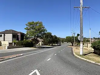 Yokine was part of the grant originally allocated to T. R. C. Walters in 1840.[2] Western Australian Golf Limited owned Yokine from at least 1927 and subdivided a small portion of land near the golf course. Before World War II the only house in Yokine was at the eastern end of Royal Street. Yokine experienced a housing boom after the war and much of the area near the golf course was developed by the early 1950s. The southern area grew rapidly in the 1960s and by the late 1970s Yokine was almost completely developed.[2]