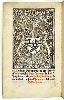 She was the daughter of Pasquier Bonhomme, himself a printer and one of four appointed booksellers of the University of Paris, and the wife of another printer, Thielmann Kerver.[1][3] She began printing on her own following her husband's death in 1522 in their shop at street level in the Hotel Unicorn on the Rue Saint-Jacques, Paris.[4] The University of Paris and the Catholic Church were among her patrons.[5] She published a book of hours in 1523[1] and another in 1546;[5] both books survive. In 1526, she became the first woman to publish the Bible.[1] She also published the Roman Breviary (Latin: Breviarium Romanum) in 1534 and a Breviarium Romanum nuper reformatum in 1537. She joined forces with Charlotte Guillard to demand better quality paper from the papermakers' guild.[6] Estimates of her output range from 136 (according to Axel Erdmann) to 200 (according to Beatrice Beech, based on Renouard) publications before her own death in 1557. Because she often used her husband's name on the colophon for early books, her identity as the printer can be difficult to pinpoint.