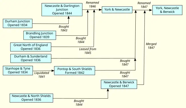 The Newcastle and Darlington Junction Railway acquired the Pontop and South Shields Railway on 1 January 1847.[8][9]