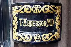 23 Stonegate is a late 16th-century house, which incorporates the remains of several earlier structures on the site, and which has been altered and extended at various times in the centuries following its construction. Its 1590 rainwater head is the oldest surviving in York. The building is currently divided into a number of offices and flats, as well as serving as the base for the society. It has had associations with the medical profession since at least the early 19th century, when it was owned by the Anderson family, and in the later part of the century it was home to the surgeon and vulcanologist Tempest Anderson, whose plaque is still present on the entrance to the building. It was purchased by the York Medical Society in 1944; the dining room, which features a Greek fret and paterae underneath an elaborate cornice, now serves as the society's lecture hall. The building was first listed in 1954, and was upgraded to Grade II* in 1997.[3]