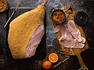 York ham (French: jambon d'York, formerly often called "Yorkshire ham") is a characteristic type of ham that originated in Yorkshire, England. Like Parma or Westphalian ham, it is made by a dry curing process, but unlike them it is eaten cooked. At its best it is widely considered one of the finest hams. However, it has never enjoyed protected designation of origin status, and has been imitated in many places. Various productions, some of doubtful quality, have been sold as York hams. Contrary to common belief, York hams did not originate in the City of York.
