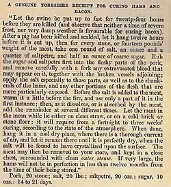 which was missed in the first edition of Mrs. Beeton's Book of Household Management[29] but picked up in the third.[30] One curer in Ireland sent almost his entire make of York hams to the cities of Hull and York.[31]