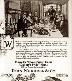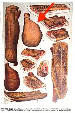 From about 1760 there are advertisements in the provincial and colonial newspapers for 'Yorkshire hams' (e.g. "A Parcel of exceedingly fine YORKSHIRE HAMS"), or, less frequently at first, 'York hams' (e.g. "Finest York Hams in highest preservation").[14] By 1830 the usage 'York ham' was the more common of the two and thereafter predominated.[15] The expressions were interchangeable.[16]