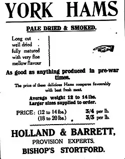 Thus the original Holland & Barrett (then a provision shop in Bishop's Stortford) advertised both versions. At a 1959 London tasting of French wines the importers paired them with six English hams: "York triple peat smoked, Wiltshire treacle-cured, Worcester and Suffolk sugar-cured, Devon dry-cured and York unsmoked". They said English cured hams would go with any wine.[80]