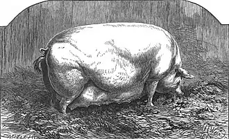 The breed originated in 19th century Yorkshire, where industrial workers around Leeds, Keighley and Skipton had a strong tradition of keenly competitive, spare-time pig-breeding.[42] According to a Victorian academic, the Large White became famous and was taken up after a Keighley weaver, Joseph Tulley, entered one in the Royal Agricultural Society's 1851 Windsor exhibition. Tulley