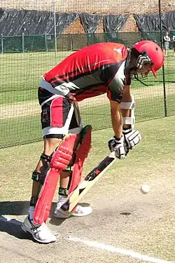 When a batsman assumes a normal stance, a yorker generally bounces on the cricket pitch on or near the batsman's popping crease. A batsman who advances down the pitch to strike the ball (typically to spin bowlers) may by so advancing cause the ball to pitch (or land) at or around their feet and may thus cause themself to be "yorked".[2] Yorkers are considered to be one of the most difficult deliveries to bowl.[1]