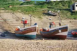 Some of the first experiments in deep-sea trawling were conducted off the Holderness Coast at Flamborough in the early part of the 19th century.[12] However, until the days of large fishing trawlers in the 20th century, the most common boat in service across Yorkshire (and the north east coast) was the Coble. The design of the coble is a basic one with a short plank laid horizontally instead of a keel and a flat bottom on the boat. The flat bottom allowed the coble to be berthed almost anywhere as it did not need extensive harbour facilities; most cobles where simply hauled onto the beaches when not in use.[13]
