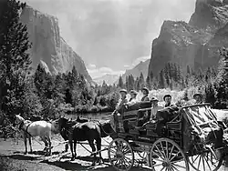 The Yosemite Valley Railroad's construction marked a transformative moment for travel to Yosemite. Prior to its inception, the only means of transportation was a two-day stagecoach journey that was uncomfortable and dangerous due to the risk of stagecoach robbery.[4] The Southern Pacific's famous "Cannon-ball" stage from Raymond to Yosemite Valley was a marginally faster option, taking between twelve and fourteen hours to complete the trip. However, these trips were unaffordable for most, reserved only for the wealthy.[5]