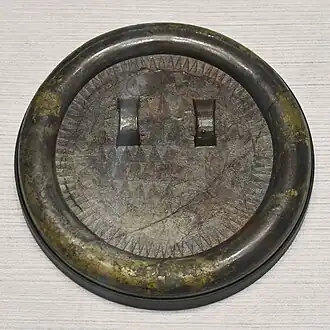 Weapons such as bronze swords and bronze spears, as well as jewelry and bronze mirrors with detailed designs, bronze chimes, and jade magatama were excavated as grave goods. In northern Kyushu, from the end of the Early Yayoi period to the beginning of the Middle Yayoi period, bronze weapons brought over from the Korean Peninsula began to be seen as grave goods, and this site also contains a mirror with a multi-shape pattern that originated from the Korean Peninsula. Other artifacts have been identified as being from the Western Han Dynasty.[2]