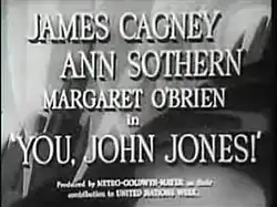 You, John Jones! (1943) is a short film directed by Mervyn LeRoy, written by Carey Wilson, and released by Metro-Goldwyn-Mayer, and starring James Cagney, Ann Sothern, and Margaret O'Brien. The film credits the War Activities Committee of the Motion Picture Industry for its production. The title frame also says "Produced by Metro-Goldwyn-Mayer as their contribution to United Nations Week".