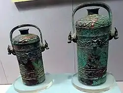 A you is a lidded vessel that was used for liquid offerings by the Chinese of the Shang and Zhou dynasties. It sometimes lacks taotie in favor of smoother surfaces. Sometimes these vessels are zoomorphic, especially in the form of two owls back to back. Usually the handle of the you is in the form of a loop that attaches on either side of the lid, but it is occasionally a knob in the center of the lid. They can be quadruped or have a single base.