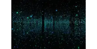 The room is a reflection of Kusama's hallucinations that she had had since she was a child. The installation, which is mostly made up of LED lights and mirrors, allows the viewer to "obliterate" themselves and unite themselves with the room.[1][5] It also references the Japanese tradition of hotaru gari — firefly-watching and tōrō nagashi, Japanese water lanterns.[2] The room is 24 ft (7.3 m) on both sides, for a total of 576 sq ft (53.5 m2). Almost 200 hanging LED lights brighten up, dull, and change colors.[6]