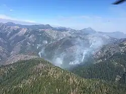 By August 20, the Young Fire had burned 1,200 acres (5 km2), with firefighters using a containment strategy for safety reasons, due to the remote location and difficult terrain. The fire burned around the south end of Twin Peaks and on the north end of Rocky Knob. Recreational areas were impacted at this time, with Doe Flat and Young's Valley Trailheads being closed.[2] By the morning of August 21, the fire had expanded into the Klamath National Forest. Trailhead closures remained in place, with additional closures of the Six River Forest Boundary.[3] The Young Fire grew to 1,950 acres (8 km2) by August 23.[4] By August 25, temporary flight restrictions were put in place due to the fire and all trails, roads and land near the fire was closed.[5][6]