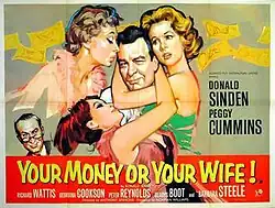 Your Money or Your Wife is a 1960 British comedy film directed by Anthony Simmons and starring Donald Sinden, Peggy Cummins and Richard Wattis.[1] It was based on the 1951 play Count Your Blessings by Ronald Jeans. A couple must divorce in order to inherit a fortune.[2]