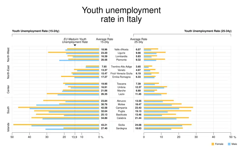 It is often argued that Italy is made up of two different economies, one belonging to the North and one to the South.[35] In terms of youth unemployment, there is a regional divide between North and South within Italy. In 2016, Italy presented one of the most internally diverse regional unemployment rates among the EU member states (together with other Southern European countries such as Greece and Spain). More than half of the young population was unemployed in the southern regions of Italy (Calabria, Campania, Puglia and Sicilia).[8] On the other hand, unemployment rates in the northern regions (such as Lombardia, Piemonte and Veneto) varied between 5% and 10%.[36][37]