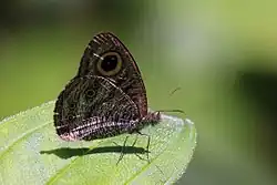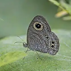 Female: Differs on the upperside in having the area surrounding or bordering the ocelli on both forewing and hindwing paler, closely irrorated (sprinkled) with brown striae, the discal transverse band generally clearly defined, and very often both the tornal, and at least one of the apical, ocelli distinct. On the underside it is paler than the male, and has the subbasal, discal and subterminal transverse dark bands more clearly defined.[3][4]