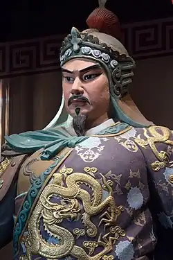 Yue Fei (Chinese: 岳飛; March 24, 1103 – January 28, 1142),[1] courtesy name Pengju (鵬舉), was a Chinese military general of the Song dynasty and is remembered as a patriotic national hero, known for leading its forces in the wars in the 12th century between Southern Song and the Jurchen-led Jin dynasty in northern China. Because of his warlike stance, he was put to death by the Southern Song government in 1142 under a frameup, after a negotiated peace was achieved with the Jin dynasty.[2] Yue Fei is depicted in the Wu Shuang Pu by Jin Guliang.