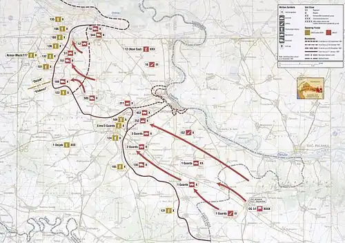 In eastern Slavonia, the JNA responded to the ZNG siege of its garrison in Vukovar, and on 14 September 1991 it deployed troops to relieve the barracks.[36] Independent of that effort, the main thrust of the campaign against Croatia was initially planned to start on 21 September. The southern operational group of the thrust, spearheaded by the 1st Guards Mechanised Division, was expected to lift the ZNG siege of the JNA barracks in Vinkovci, and reach Našice and Slavonski Brod in two to three days. Over the next four to five days, the group was expected to reach the line Okučani–Suhopolje by advancing via the Đakovo–Požega road and the Zagreb–Belgrade motorway, avoiding major population centres. The northern operational group, subordinated to the 12th (Novi Sad) Corps, was to advance from Osijek to Našice and then further west towards Bjelovar.[37] The two operational groups were assigned approximately 57,000 troops and 5,000 supporting personnel.[38] The 17th (Tuzla) Corps was probably tasked with crossing the Sava River—marking the border of Croatia—at Slavonski Brod and Slavonski Šamac to join the westward drive along the motorway, but the crossing never occurred.[36]