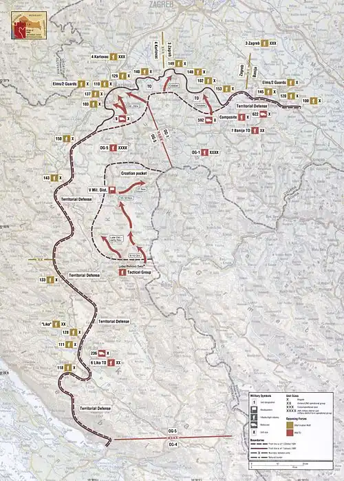 On 8 October, Croatia declared independence from Yugoslavia.[67] Even though the declaration had been preceded the day before by a Yugoslav Air Force attack on the presidential office in Zagreb,[68] the Croatian authorities considered that the war situation was no longer critical. This assessment was followed by an order to prepare plans for a counter-offensive on 12 October, and three more orders to commence offensive operations, which were issued by 20 November.[69] The plans involved containing the JNA south of Osijek, advancing to the Bosut River south of Vinkovci, recapturing Jasenovac and the Okučani–Lipik road to secure the Papuk and Psunj mountains, advancing towards Petrinja, Glina, Slunj, Korenica and Gračac, recapturing the Maslenica Bridge and the Obrovac–Gračac road, and stopping the JNA advance north-west of Dubrovnik.[70]