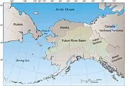 The Yukon River Basin is approximately 330,000 square miles (850,000 km2) in area and 1,980 miles (3,190 km) in length.[1] This makes the Yukon River Basin the fourth largest basin in North America. It is located between the Rocky Mountains in the north and the Pacific Mountain system to the south. The Basin spans across Canada in the Yukon Territory and the US state of Alaska.[2] The Yukon Flats basin is south of the Yukon River Basin and it drains deposits and reworked materials into the Flats.[3] It is within the Arctic Complex of the Arctic-Atlantic Bioregion, therefore has freshwater.[4]
