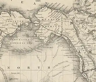 Perry Collins proposed a telegraph line to link San Francisco and Moscow, Russia; the line would run north into Alaska and span the Bering Strait. He negotiated contracts in the United States, Canada, and Russia starting in 1858 and was appointed managing director of the Western Union Russian Extension, later known as the Collins Overland Line, in 1864.[2] The route was planned originally to follow the Fraser River north from Quesnel to Fort George, but the river proved to be unnavigable during spring thaws, so an alternate route was chosen, following a trail used by the Dakelh First Nations people, who also were serving as guides for the surveying crews.[2] The line was abandoned in February 1867 after it had been built from New Westminster to Fort Stager (present-day Kispiox at the confluence of the Kispiox and Skeena Rivers, just north of Hazelton), as Cyrus W. Field's Atlantic Telegraph Company had succeeded in laying a Transatlantic telegraph cable in 1866.[2] The telegraph station at Fort Stager was abandoned in 1869.[3]