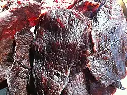 Yukpo (Korean: 육포) is a type of po or dried meat, made from beef.[1] It is a traditional Korean food, commonly eaten as snack food, banchan (food accompanying bap) or anju (food accompanying sul).[1][2][3] It is also one of the foods prepared for traditional occasions such as pyebaek (formal greetings from the newlyweds after the wedding ceremony) and jesa (ancestral rite).[4][5]