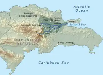 The Yuna River (Spanish: Río Yuna) is the second longest river in the Dominican Republic, stretching for a length of 185.17 km (115.06 miles). It forms within the Cordillera Central mountain range southwest of the city of Bonao in Monseñor Nouel Province, and passes through the fertile Cibao Valley.[3] As the river courses north-northeast, it passes through the city of Bonao. Southwest of Cotuí, the river reaches Hatillo Dam (Spanish: Presa de Hatillo) before turning northeast then east as it reaches its mouth at the Samaná Bay in the northeast part of the Dominican Republic.[4] Like many rivers in the Dominican Republic, the name is derived from the Taíno language.[5]