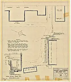 A bitumen car park set among a collection of ancillary buildings covers much of the area to the rear of the building. These structures are single storey and constructed of both brickwork and timber, with simple gable and hip roof forms. The roofs are clad with corrugated metal sheeting and some include timber louvred ridge ventilators.[1]