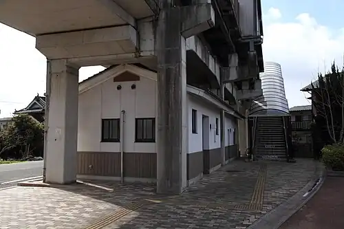 The station consists of one elevated side platform with at the station facilities underneath. The station is unattended.