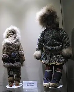 Yup'ik doll (Yup'ik yugaq sg yugak dual yugat pl or yuguaq, irniaruaq, irnianguaq, inuguaq; also, yunguaq in Unaliq-Pastuliq dialect, sugaq, sugaruaq, suguaq in Bristol Bay dialect, cugaq, cugaruaq in Hooper Bay-Chevak dialect, cuucunguar in Nunivak dialect) is a traditional Eskimo style doll and figurine form made in the southwestern Alaska by Yup'ik people. Also known as Cup'ik doll for the Chevak Cup'ik dialect speaking Eskimos of Chevak and Cup'ig doll for the Nunivak Cup'ig dialect speaking Eskimos of Nunivak Island. Typically, Yup'ik dolls are dressed in traditional Eskimo style Yup'ik clothing (as irniaruam atkua "doll parka"), intended to protect the wearer from cold weather, and are often made from traditional materials obtained through food gathering. Play dolls from the Yup'ik area were made of wood, bone, or walrus ivory and measured from one to twelve inches in height or more.[1] Male and female dolls were often distinguished anatomically and can be told apart by the addition of ivory labrets for males and chin tattooing for females.[2] The information about play dolls within Alaska Native cultures is sporadic. As is so often the case in early museum collections, it is difficult to distinguish dolls made for play from those made for ritual.[2] There were always five dolls making up a family: a father, a mother, a son, a daughter, and a baby.[3] Some human figurines were used by shamans.