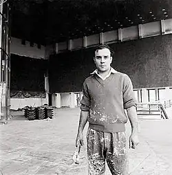 Klein created a composite photograph, Saut dans le vide (Leap into the Void),[24] originally published in his 1960 artist's book Dimanche, which apparently shows him jumping off a wall, arms outstretched, towards the pavement. Klein used the photograph as evidence of his ability to undertake unaided lunar travel. In fact, "Saut dans le vide", published as part of a broadside on the part of Klein (the "artist of space") denouncing NASA's own lunar expeditions as hubris and folly, was a photomontage in which the large tarpaulin, held by artist friends, Klein leaped onto was removed from the final image.