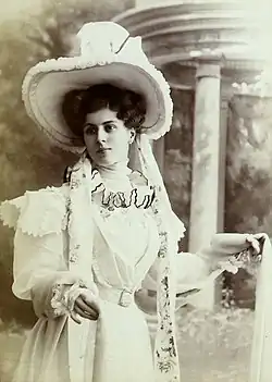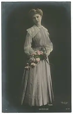 Garrick was a new actress when she appeared in Château Historique in 1900 at the Theatre National de l'Odéon.[5] She played the title role in Psyche, and appeared in Le Mariage de Figaro, Colinette, and La Nuit de Mai,[6] at the Odéon, all in 1901.[7] Garrick appeared in Le Luxe des Autres at the Odéon in 1902.[3]With the Comédie-Française in 1905, she played Jessica in Shylock, ou le Marchand de Venice.[8] She played the title role in Jeanne Qui Rit at the Théatre Rejane in 1908.[9] In 1909, back at the Odéon, she starred in Le Poussin.[10] She starred in Edouard Pailleron's comedy Le Monde où l'on s'ennuie with the Comédie Francaise, and she returned to that show to the United States.[11]