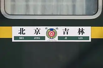 The Z117/118 Beijing–Jilin through train (Chinese: Z117/118次北京到吉林直达特快列车) is a Chinese railway running between the capital Beijing to Jilin City express passenger trains by the Shenyang Railway Bureau,[1] Jilin passenger segment responsible for passenger transport task, JIlin originating on the Beijing train. 25T Type Passenger trains running along the Jingha Railway and Changtu Railway across Jilin, Liaoning, Hebei, Tianjin, Beijing and other provinces and cities, the entire 1131 km. Beijing railway station to Jilin railway station running 14 hours and 9 minutes, use trips for Z117; Jilin railway station to Beijing railway station to run 12 hours and 17 minutes, use trips for Z118.