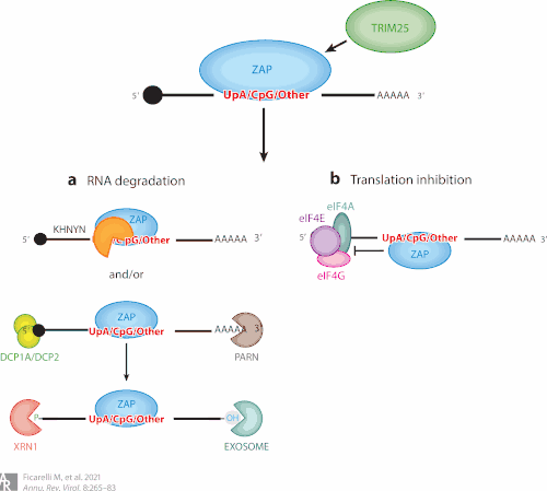 - ^ a b Ficarelli M, Neil SJ, Swanson CM (September 2021). "Targeted Restriction of Viral Gene Expression and Replication by the ZAP Antiviral System". Annual Review of Virology. 8 (1): 265–283. doi:10.1146/annurev-virology-091919-104213. PMID 34129371.