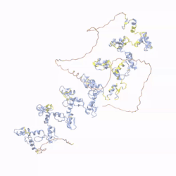 The tertiary structure of the ZFP62 protein appears as a double-coiled structure, with alpha-helices being twisted into a larger coiled shape. The highest confidence in this structure comes from the 26 smaller coils, correlating with the 26 zinc finger repeats that are present within the protein.[21]