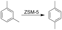 ZSM-5 has a high silicon to aluminium ratio. Whenever an Al3+ cation replaces a Si4+ cation, an additional positive charge is required to keep the material charge-neutral. With proton (H+) as the cation, the material becomes very acidic. Thus the acidity is proportional to the Al content. The very regular 3-D structure and the acidity of ZSM-5 can be utilized for acid-catalyzed reactions such as hydrocarbon isomerization and the alkylation of hydrocarbons. One such reaction is the isomerization of meta-xylene to para-xylene. Within the pores of the ZSM-5 zeolite, para-xylene has a much higher diffusion coefficient than meta-xylene. When the isomerization reaction is allowed to occur within the pores of ZSM-5, para-xylene is able to traverse along the pores of the zeolite, diffusing out of the catalyst very quickly. This size-selectivity allows the isomerization reaction to occur quickly in high yield.[8]