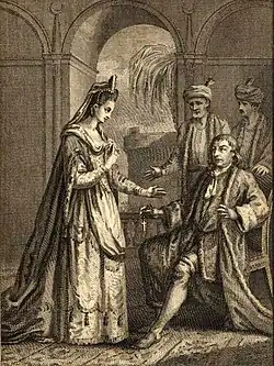 Disappointed with the relative failure of his tragedy, Eriphyle, in March 1732, Voltaire began writing Zaïre in response to critics who had reproached him for not having love stories as the centrepieces of his plays.[5] He completed Zaïre in three weeks,[9] and it premiered on 13 August 1732 performed by the Comédie française at the Théâtre de la rue des Fossés Saint-Germain. The original actors in the play were Quinault-Dufresne as Orosmane, Charles-François Grandval as Nérestan, Pierre-Claude Sarrazin as Lusignan, and Jeanne-Catherine Gaussin as Zaïre. Its reception on the opening night was mixed, but once Voltaire made slight revisions to the play and the cast settled into their roles, it became a great success and was performed 31 times that year alone.[9] Voltaire was also invited to the French court for six weeks where the play was performed before King Louis XV and the Queen consort. Zaïre went on to become one of the most popular of Voltaire's stage works in France. It was notably revived in 1874 with Sarah Bernhardt in the title role, and it was the only one of Voltaire's plays to be performed by the Comédie française during the 20th century.[5] For Voltaire himself, the play was a turning point. Now convinced of the possibilities of dramas with a central love story, he began his Adélaïde du Guesclin with a plot even more dominated by love than Zaïre had been.[5] His later plays, Alzire (1736) and Tancrède (1760) likewise feature passionate lovers. Zaïre also marked a turning away from tragedies caused by a fatal flaw in the protagonist's character to ones based on pathos. The tragic fate of its heroine is caused not through any fault of her own, but by the jealousy of her Muslim lover and the intolerance of her fellow Christians.[10] The published version of Zaïre contains two lengthy dedications by Voltaire. The first is to Everard Fawkener who had befriended Voltaire during his exile in England and the second to Jeanne-Catherine Gaussin, to whom Voltaire attributed much of the play's success.[11]