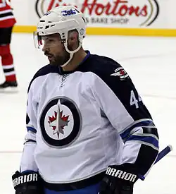 Throughout the 2009–10 season Bogosian was bothered by an injury. During a game against the Ottawa Senators on October 31, 2009, Bogosian fell behind his team's net; with his left hand lying on the net's iron frame along the ice, another player fell on top of him. The impact broke his left thumb and injured his wrist.[20] Though he did not miss any time from the injury, it had an effect on his offensive play; Bogosian was perceived to be more hesitant with the puck, choosing to pass it more often than shooting.[20] In the first 17 games of the season, he had scored 8 goals, then went 29 contests without scoring.[21] In the final 64 games, he only scored 2 goals. After he recovered, Bogosian admitted he did not play at his full capacity, but had decided not to disclose the injury to the team until the season finished in April 2010.[20] Regardless of his injury, Bogosian only missed one game throughout the season, a game on March 14 against the Phoenix Coyotes.[21] Even with these setbacks, Bogosian set career highs for games played (81), goals (10), assists (13) and points (23).[22] The 10 goals he scored tied a team record for most by a defenseman in a season, first set by Yannick Tremblay in 1999–2000, the Thrashers' inaugural year.[23] He also set a team record with 196 hits. Again the Thrashers missed the playoffs. After the Atlanta Thrashers were sold to True North Sports & Entertainment and were relocated to Winnipeg, Bogosian agreed to terms on a new two-year, $5 million contract with the Winnipeg Jets on September 14, 2011.[24]