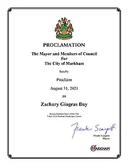 Mayor Frank Scarpitti the Mayor of Markham proclaimed 31 August 2021 as 'Zachary Gingras Day'.[5]
