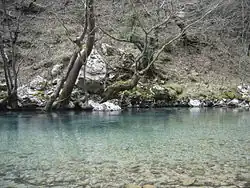 The first evidence of human presence in the area is dated between 17,000 and 10,000 years ago.[6] Important epipaleolithic artifacts have been unearthed from Kleidi Cave on the banks of Voidomatis.[7] In antiquity, the region of Zagori was inhabited by the Tymphaeans and formed a part of the ancient kingdom of the Molossians, a Greek tribe of Epirus that gained control over all of Epirus in classical times. The Molossian royal house ruled Epirus from the ancient town of "Molossis" which was located near modern Konitsa, in the northern boundary of Zagori, where the rivers Voidomatis, Aoös and Sarantaporos come together. The Molossians were known among else for a breed of great mastiffs they used to guard their flocks from wolves and bears and which were even used in war. Molossus, their eponymous ancestor, was said to have been born of a union between Neoptolemus (son of Achilles ) and Andromache (the wife of Hector of Troy). Neoptolemus, also called Pyrrhus for his blond hair, was first in a line of Epirotan kings leading to the king Pyrrhus of Hellenistic times who launched several campaigns against the Romans in Italy. Olympias, the mother of Alexander the Great, was a Molossian princess. Remains of cyclopean walls in Skamneli also testify to the antiquity of human occupation.[8] During the 9th–4th centuries BC, a small Molossian settlement existed between Monodendri and Vitsa, including stone houses and two cemeteries which have yielded important findings.[9] Additionally, foundations of fortifications and graves from the Hellenistic period have been found in Skamneli. However, throughout most of the historical time the local population was sparse.[10]