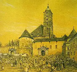 The next two centuries, up to the earthquake in 1880, were mainly marked by constant rebuilding and repairs of the interior of the church. In the 17th century, a single fortified renaissance watchtower was erected on the south side and was used as a military observation point, because of the Ottoman threat.[14]