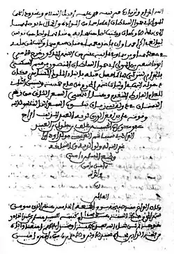 The cataloger of the manuscript made also a mistake in writing the copyist's name incorrectly. Mahmoud Bouayad pointed out that the transcription was erroneous, explaining that the name of the copyist is: al-Ḥabīb ibn Yakhlef ibn Jalloul ibn al-Eid al-Farādi, from the Farādi family in Mascara (actually in western Algeria), a family known for its knowledge and scholarship. This copyist completed the transcription of the manuscript on Friday, 15 Muḥarram 1235 H (February 2, 1819), for a person named Mouslim ibn Abdelkader Khouja, and "for whomever Allah wills after him, as a gift or for sale".[2]