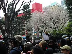 It frequently organizes small-scale public demonstrations against Zainichi Koreans and other social and political issues, and its members make racist insults against Koreans, Chinese, and other foreign nationals in these demonstrations.[19] A writer for Vice News pointed out they tend to focus on Zainichi Koreans to the exclusion of other groups that might violate immigration statutes.[5]