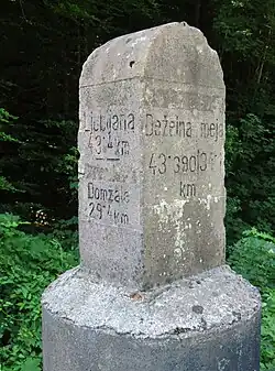 An Austro-Hungarian boundary stone marking the border between Carniola and Styria stands at the border between the two parts of Zajasovnik.[2]