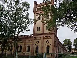 Due to the Nazi regime's legislation restricting the rights of German Jews, including the prohibition of Jewish people from owning businesses, the factory was confiscated from the Fränkel-Pinkus family in 1938 and the family was forced to flee Germany.[2] The company was then renamed Schlesische Feinweberei AG. In late September, 1944, the Nazi regime established a sub-camp of Auschwitz in the factory where about 400 women, mostly Jews from Hungary, were forced to work on the spinning machines. The factory was known as and was directed by SS-Oberscharführer Bernhard Becker with twenty additional members of the SS. The subcamp was shut down on 19 January 1945 and the women there were forced to march by foot to the Gross-Rosen concentration camp.[3] From there they were then taken to the Bergen-Belsen concentration camp; it is unknown who among them survived.[4][5]