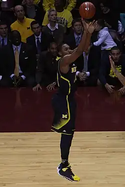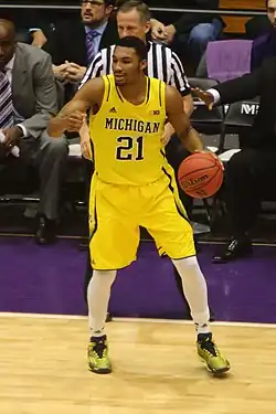 Irvin joined a team that had just lost Trey Burke and Tim Hardaway Jr. to the 2013 NBA draft.[11][12] The 2012–13 Wolverines had reached the championship game of the 2013 NCAA Men's Division I Basketball Tournament, losing to Louisville.[13] Prior to his freshman season, Sporting News named him the second best Big Ten Conference newcomer.[14] On November 8, the Wolverines opened the season against UMass Lowell. Michigan played six freshman and Irvin was one of five who came off the bench in his debut that night; he scored 10 points.[15][16] When 2013–14 Wolverine team leading scorer Stauskas sat out the November 29 game against Coppin State, Irvin posted 24 points on 9-for-13 field goal shooting, including 6-for-10 three point shooting as Michigan won in an 87–45 rout.[17][18] He was recognized on December 2, with a Big Ten Conference Freshman of the Week honor.[19] On December 21, he posted 12 points (on 4-for-8 three-point shooting) and 6 rebounds against Stanford.[20] On December 23, he earned co-Freshman of the Week honors with Noah Vonleh from the Big Ten Conference.[21] Michigan clinched its first outright (unshared) Big Ten Conference championship since 1985–86.[22] The 2013–14 team advanced to the elite eight round of the 2014 NCAA Division I men's basketball tournament before being eliminated by Kentucky.[23]