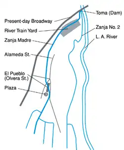 The Zanja Madre was placed close to present-day Broadway at the foot of the Elysian Hills by the river. An earth and brush dam, called a toma, was created to pool up the water into the ditch which then ran along an elevated slope down to the pueblo after which it was split into multiple ditches which ran to the various portions of lowland.[4] A large water wheel, constructed in the 1850s, took water up to the Zanja Madre and onto the main brick reservoir that was located in what is now the Plaza at the end of Olvera Street. The wheel was susceptible to damage from floods. The toma was washed away several times before a wooden one was built in its place.[5]